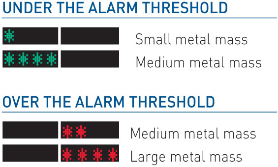A "height on person" display actually indicates, by means of illuminated LED’s, the position of the weapon. The location zones are not fixed, as in the case of metal detectors with multiple receiver-transmitter coils, but variable and continuous to achieve optimum resolution. The PMD2 Metal Detector is recommended for use in all high security applications where the maximum degree of protection is required, combined with a substantial flow of people and the minimum number of alarms due to personal metal items.